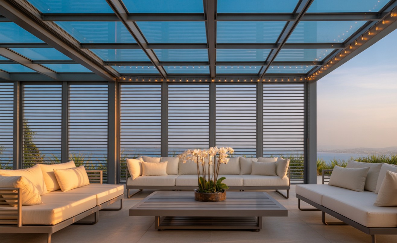 Soluciones de exterior para control solar inteligente y confort óptimo durante todo el año. Diseño moderno con materiales de alta durabilidad.